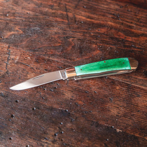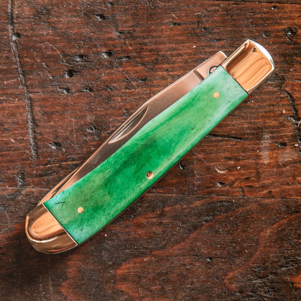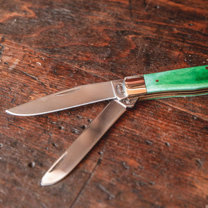 4.25" (10.8cm) closed. Mirror finish stainless clip and spey blades. Green smooth bone handle. Nickel silver bolster(s). Imported.